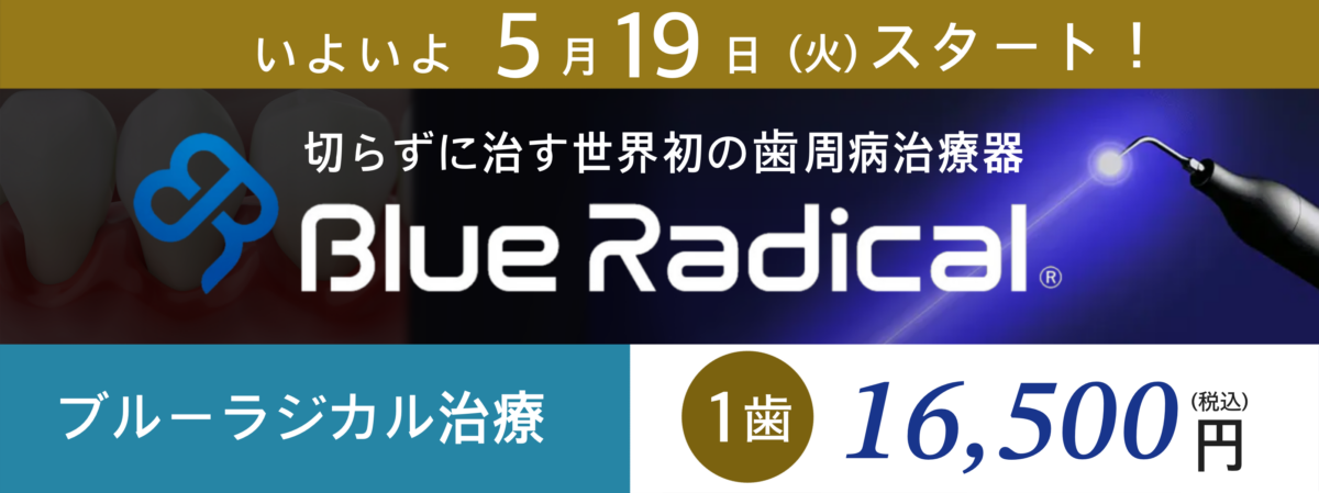 当院では、軽度から重度までの歯周病に対応しており、非外科的治療のひとつであるブルーラジカルを含め、さまざまな方法でできるだけ歯を残せるように治療を行っています。